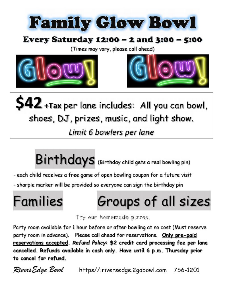 Family Glow Bowls are currently available from 3-5 p.m. only. We will resume 12-2 Family Glow bowls in January 2026